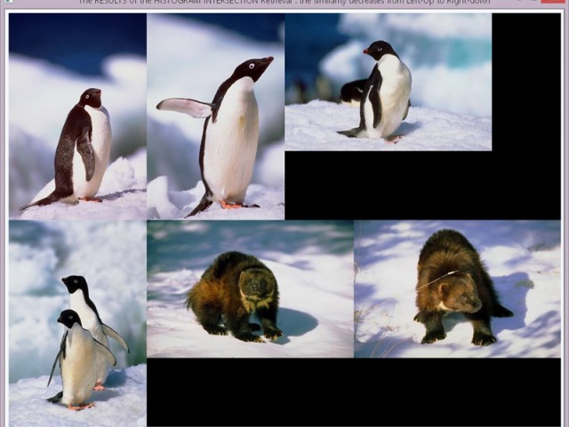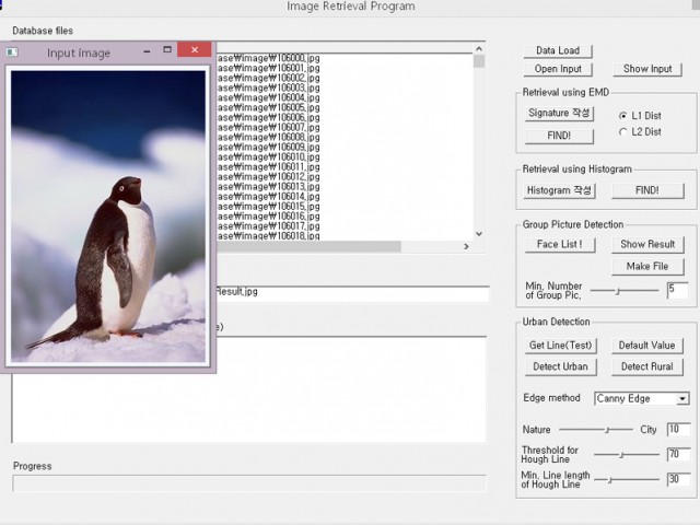 This project was conducted in 2008 for my bachelor's thesis in the Department of Electrical Engineering at Seoul National University (it was more like a capstone project rather than a thesis, since the focus of the project was mainly at implementing algorithms rather than analyzing the performance of algorithms using concrete measures, e.g., recall and precision). I implemented an image retrieval system prototype that takes an image as input, and outputs most similar images from the image database. The measures used for the retrieval were color similarities: Earth Mover's Distance and Histogram Intersection. I compared the performance of the two metrics qualitatively by looking at the output images. The target image database was the Corel image dataset. The algorithms and GUI were implemented using MFC (Visual C++ 6.0) and OpenCV (image processing library). This project showed that histogram intersection was better in finding top-6 similar images (potentially high precision) than using Earth Mover's Distance for the target dataset.